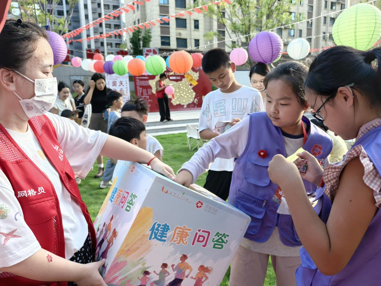 活动现场,彩色灯笼点缀草坪,党建主题剪纸作品栩栩如生,处处弥漫着红色文化与青春活力相互交融的浓厚氛围。社区志愿者身着红色背心,耐心地与小朋友们开展党建知识问答互动。小朋友们手持问答卡片,认真思考、踊跃作答。