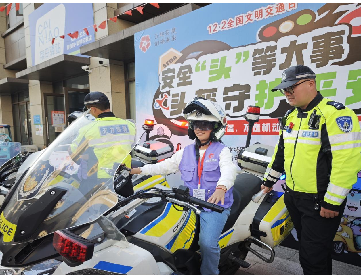 打卡区成为“安全宣传流动窗口”。印着伴有守护交通安全的背景板前,家长带孩子戴盔合影,定格对安全理念的认同与家庭出行承诺。参与者出示配文“安全从‘头’做起,我为头盔安全代言!”的朋友圈,可获取头盔或电动车雨披奖励,让承诺落地。