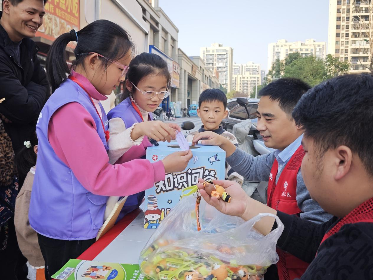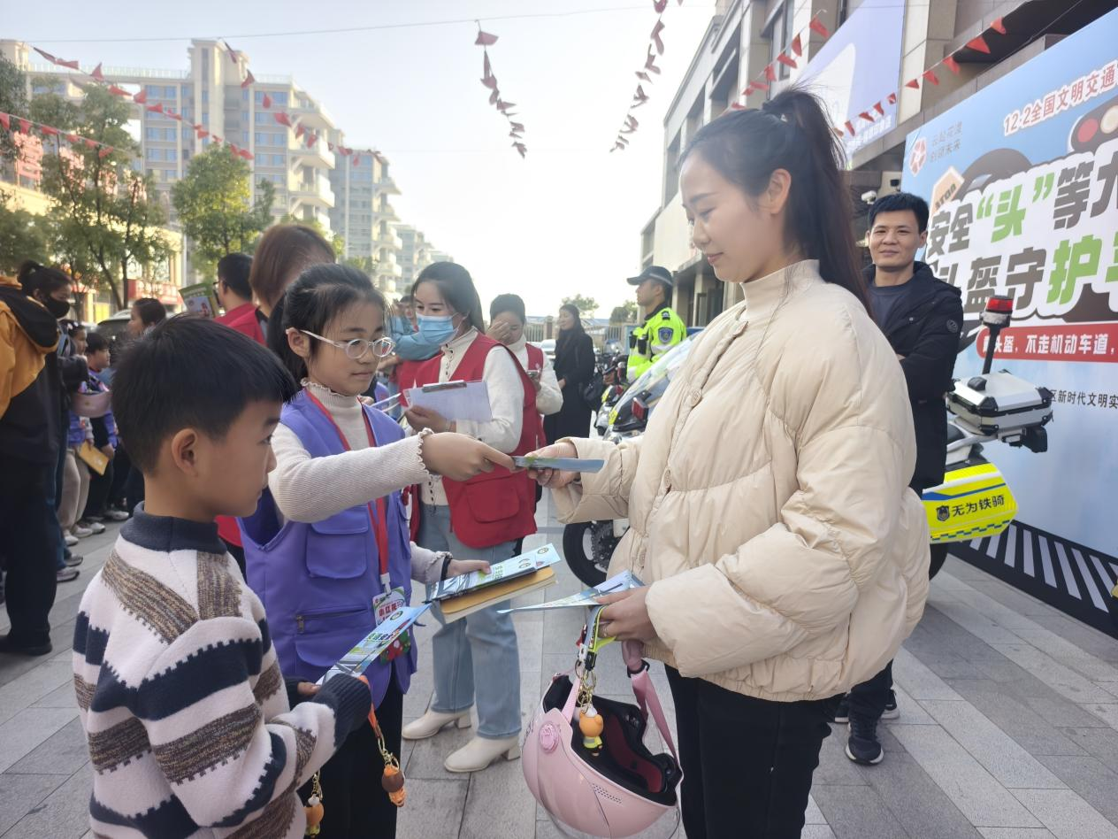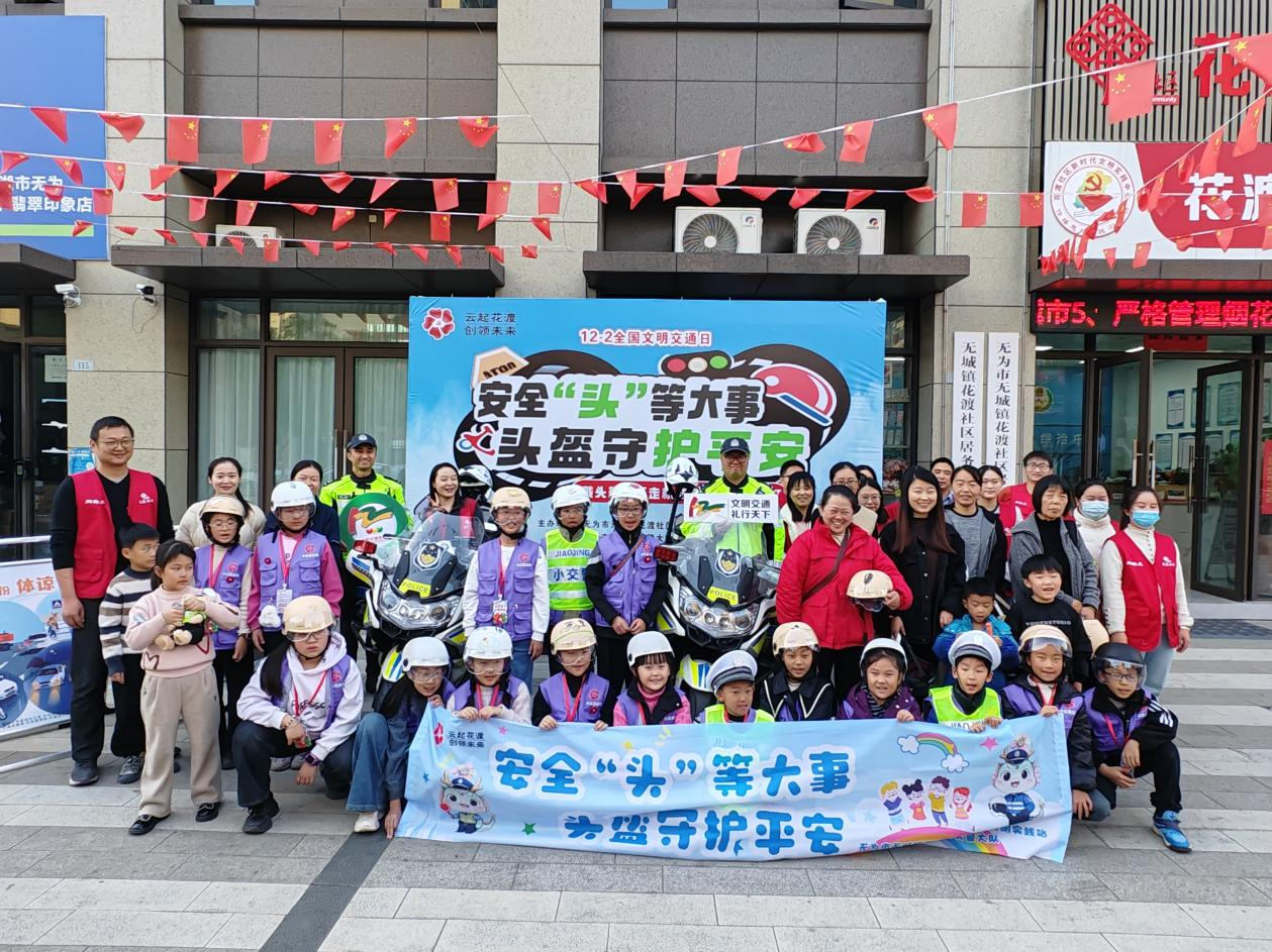 11月30日下午,花渡社区联合无为交管大队开展“安全‘头’等大事 头盔守护平安”主题头盔安全宣传行动,20名小红花记者团成员与家长、交警、社区工作人员携手,以多元形式播撒交通安全种子。
