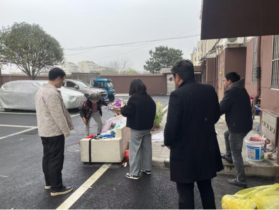 清理行动中,社区干部、网格员、物业人员及热心志愿者共计10余人参与。现场,物业人员和社区工作人员深入各个楼道口,将堆积已久的废旧家具、纸箱、易燃杂物等逐一搬运至楼下。由于部分杂物堆放时间较长,积灰严重,搬运过程中扬尘四起,但在大家的默契配合下,清理工作有序推进。不一会儿,一辆辆三轮车便被各类杂物堆得满满当当,陆续运往集中处理点。