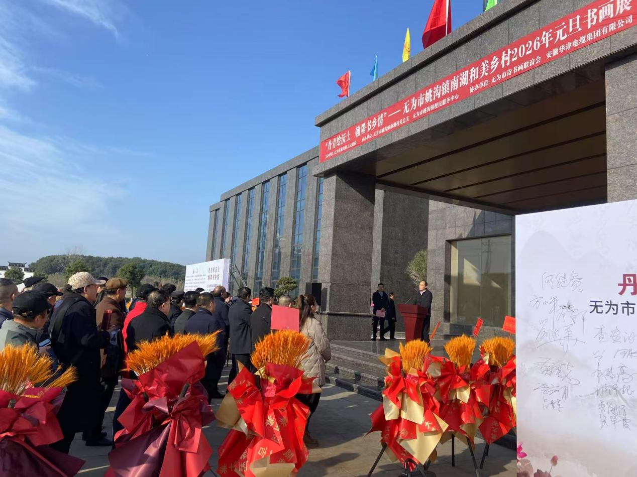 为深入贯彻落实乡村振兴战略,弘扬中华优秀传统文化,丰富辖区群众的精神文化生活,2025年12月28日9时,由姚沟镇人民政府主办,姚沟镇南湖村、姚沟镇便民服务中心承办的“丹青绘沃土翰墨书乡情”——无为姚沟镇南湖和美乡村2026年元旦书画展在安徽华津电缆集团有限公司隆重开幕。全市书画爱好者及当地群众共计200余人参加了开幕式。