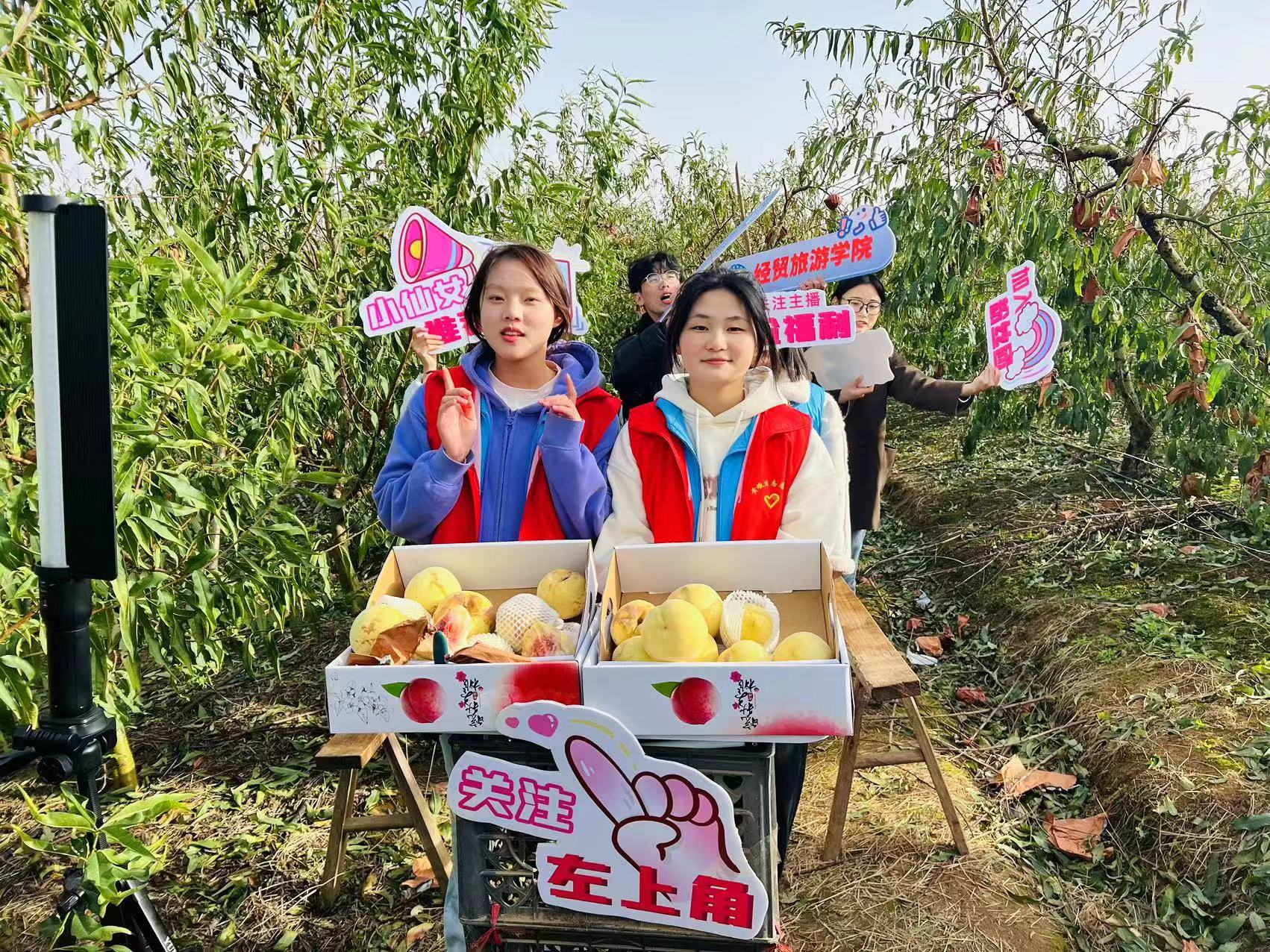 图为合肥技术职业学院经贸旅游学院学生帮助辖区内果农进行农产品宣传推广
