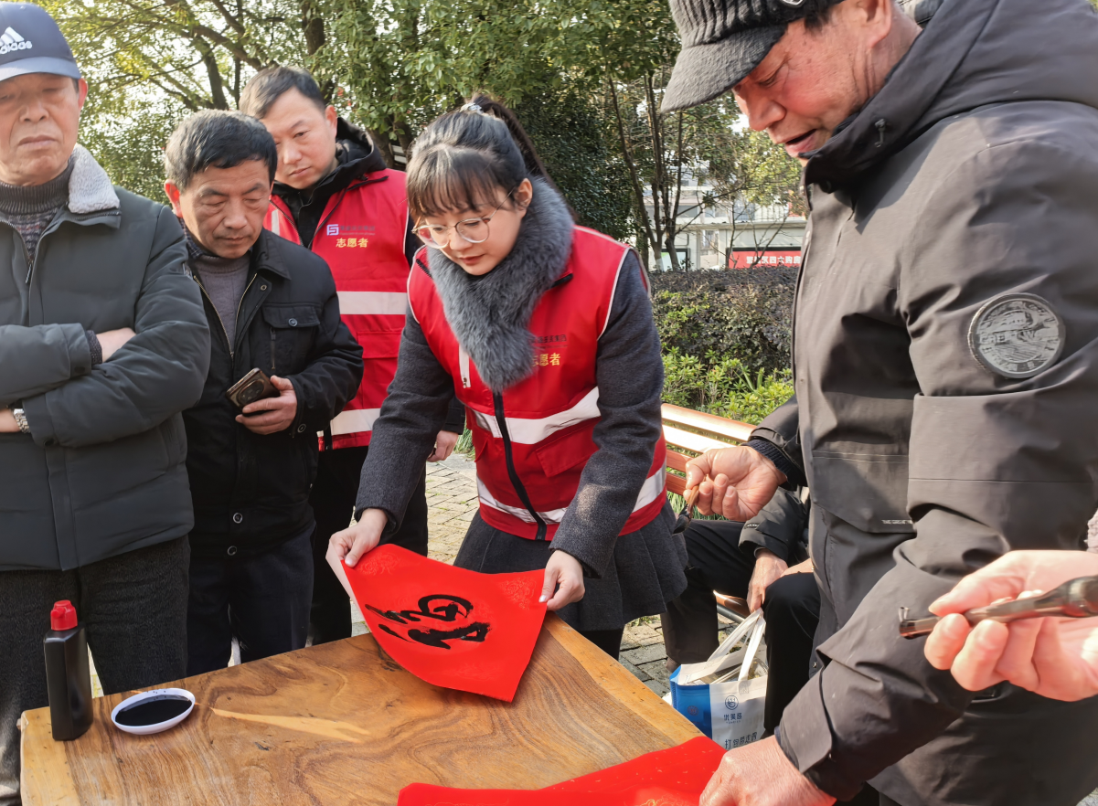 活动现场暖意融融,志愿者们身着红马甲穿梭其间、热情服务。大红春联铺展于桌,书法爱好者挥毫泼墨,墨香阵阵间,一副副寓意吉祥的春联跃然纸上,居民们围拢周边认真挑选;志愿理发师手法娴熟,耐心为居民修剪发型,老人们理完发后连连道谢;爱心义诊区里,志愿者们量血压、答疑解惑,普及健康知识……现场欢声笑语不断,处处洋溢着浓浓的温情与年味。