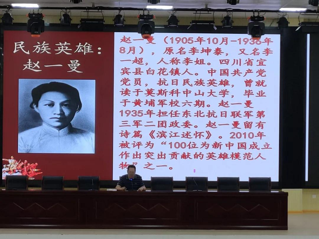 在叶成杰同志的娓娓道来中,赵一曼的一生徐徐铺开。赵一曼,原名李坤泰,1905年生,1935年被捕入狱,1936年被杀害,年仅31岁。在狱中,她顶住敌人残酷的刑讯逼问,誓不透露丝毫关于抗战队伍的信息,曾作“未惜头颅新故国,甘将热血沃中华”表达慷慨激昂的无畏精神。她不仅是一位抗日女英雄,一位革命烈士,更是一位伟大的母亲。会上播放了后人朗诵其生前遗书《写给宁儿的一封信》相关视频,字字泣泪,饱含悲壮之情。赵一曼的事迹让在场师生纷纷动容,感慨不已。英雄沾染血色的事迹显示党一路走来历程艰辛无比,同时党的事业辉煌无比,今日的幸福生活后人更应珍惜。