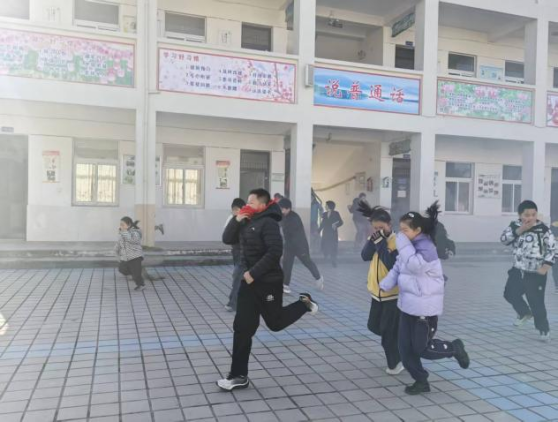 各楼层安全岗导护教师迅速就位,沉着指挥。各班学生在班主任的带领下,严格按照应急预案要求,用湿毛巾捂住口鼻,弯腰低姿,沿着预定疏散路线,快速、有序地从教学楼撤离至学校操场的安全地带。