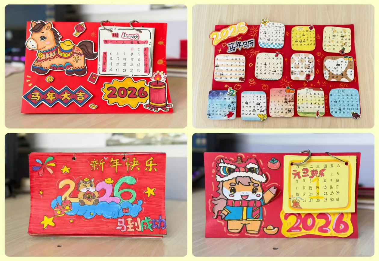 手工制作新年台历环节中,孩子们围坐在一起,手持彩纸、剪刀、画笔等材料,在指导教师的耐心引导下构思设计,让每一本台历都成为独一无二的新年纪念。大家互帮互助、交流技巧,在裁剪、粘贴、绘制的过程中,既锻炼了动手能力,又体会到了劳动创造美的乐趣,践行了“劳育”理念。