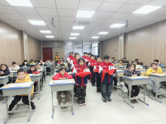 在授巾环节,高年级的老队员们迈着整齐的步伐走到新生面前,郑重地为他们系上鲜艳的红领巾。一抹抹“中国红”在新生胸前飘扬,不仅是一份荣誉的象征,更承载着一份沉甸甸的责任。新队员们轻轻抚摸着红领巾,眼神中充满了对未来的憧憬。紧接着,全体新队员举起右拳,在队旗下庄严宣誓:“我是中国少年先锋队队员……”铿锵有力的誓言回荡在校园上空,表达了他们为共产主义事业而奋斗的决心。