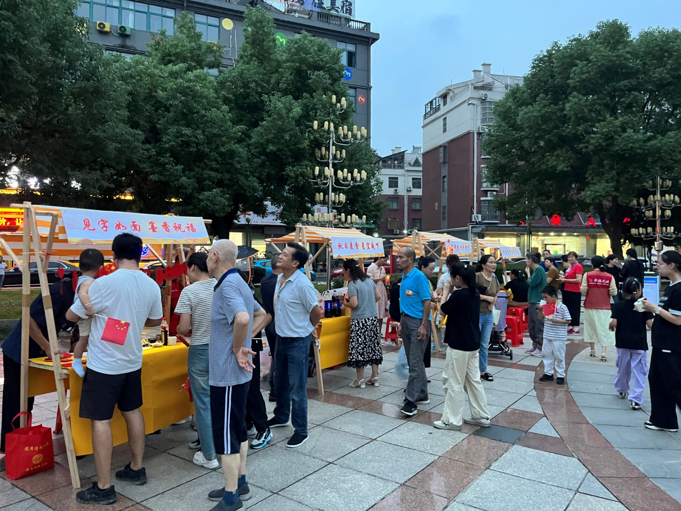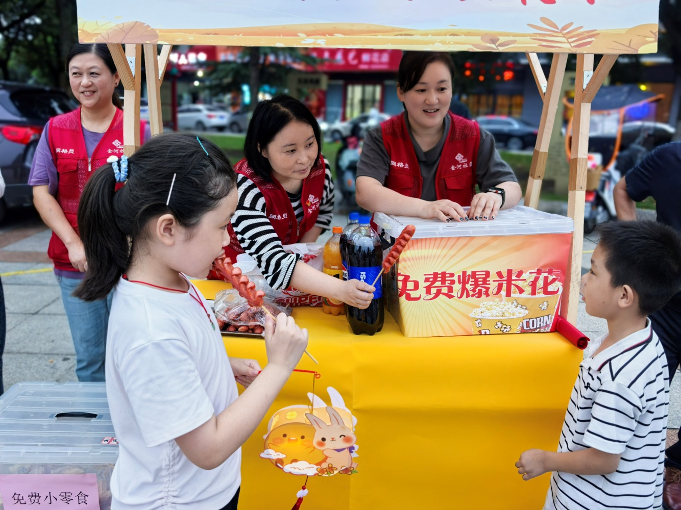 中秋花灯制作区则成为亲子互动的乐园,家长与孩子携手折叠、粘贴,一盏盏造型各异的中秋花灯在笑声中点亮,提前传递节日的温馨。“见字如面”专区墨香氤氲,书法老师挥毫写下“万事顺遂”“邻里一家亲”等祝福语,居民们争相领取这份手写温情。最受欢迎的,莫过于“免费零食摊位”,烤肠、爆米花,以及各种饮品等时令小零食供不应求,居民王阿姨笑言:“边吃边逛,像过年一样热闹!”