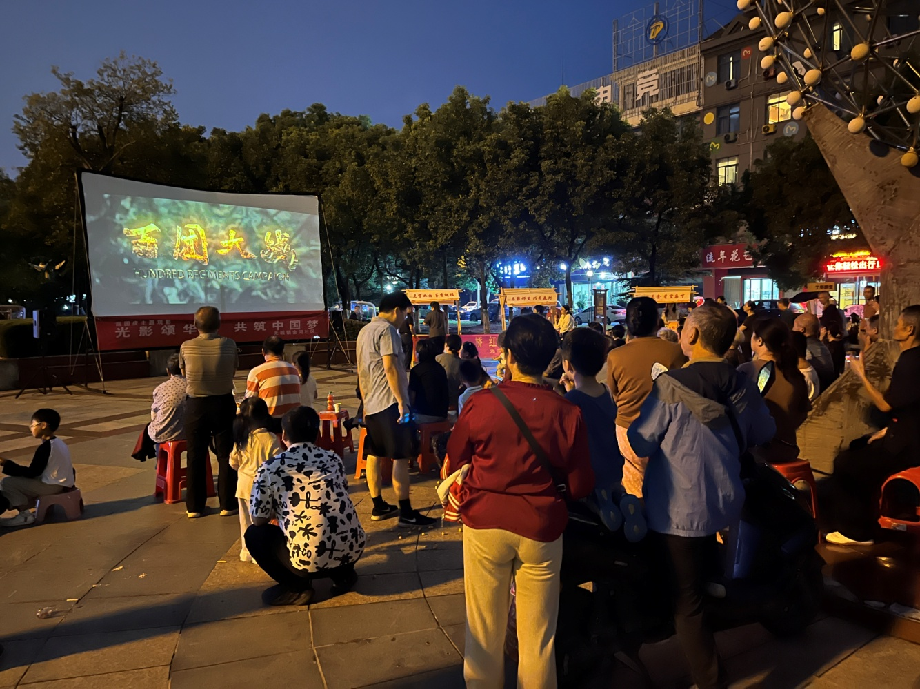 夜幕降临,广场中央的银幕亮起,经典红色影片《百团大战》准时放映。居民们或自带板凳,或席地而坐,孩子们依偎在家长身旁,老人们摇着蒲扇重温往昔。当熟悉的旋律响起,集体观影的仪式感让不同年龄层的居民跨越代际,在光影中共享感动。影片结束后,居民陶先生感慨:“这样的场景让我想起小时候全村人一起看电影的日子,现在和邻居们一起看,更有家的感觉。”