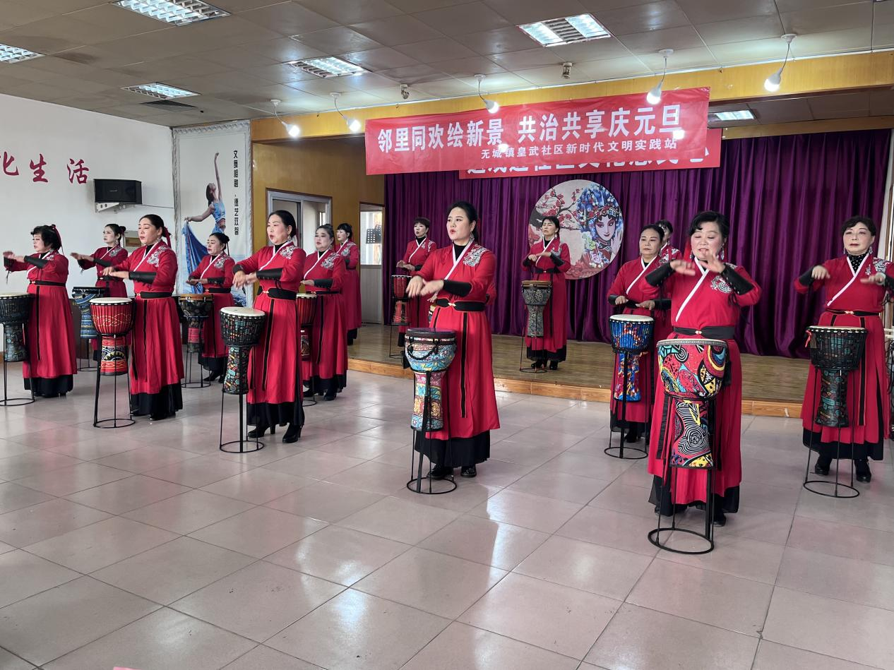 为丰富群众的文化生活,营造浓厚的节日氛围,近日,无城镇皇武社区新时代文明实践站开展“邻里同欢绘新景 共治共享庆元旦”主题文艺演出活动。活动通过歌舞表演、非洲鼓、理论宣讲、互动问答等形式,吸引了辖区百余名党员、群众踊跃参与观看,大家欢聚