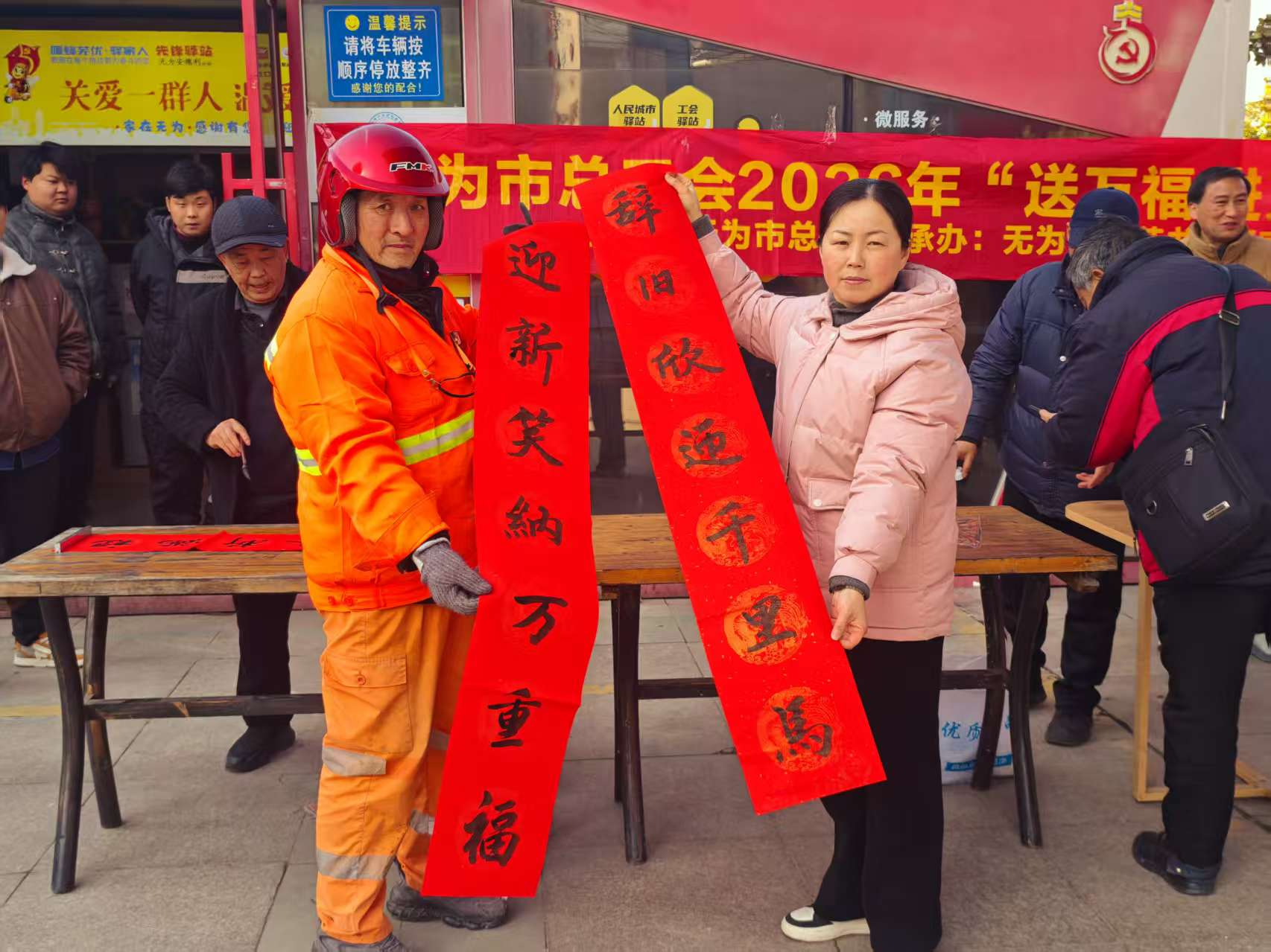 闻讯而来的快递员、外卖骑手等两新群体与居民络绎不绝,大家或驻足欣赏书法技艺,或“点单”定制专属春联,脸上洋溢着幸福笑容。“平时跑单忙,没想到社区和工会专门为我们送春联,手写的墨宝比买的更有年味!”刚领到春联的外卖骑手小李欣喜地说。社区工作人员与工会志愿者穿梭其间,协助铺纸、晾晒、整理春联,将一幅幅墨香四溢的“福礼”送到大家手中。