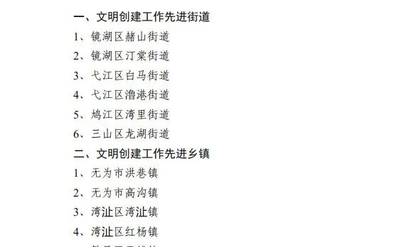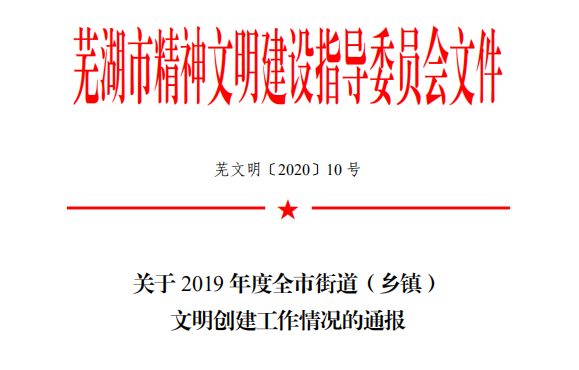 日前,根据中共芜湖市委办公室文件《关于实行市领导联系街道(乡镇)督查创建全国文明城市工作的通知》(芜市办〔2011〕33 号)要求,经市文明办推荐上报,结合芜湖市文明办日常检查情况,芜湖市文明委决定,授予镜湖区赭山街道、无为市洪巷镇等16个单位2019年度全市文明创建工作先进街道(乡镇)荣誉称号。其中,无为市2镇上榜。