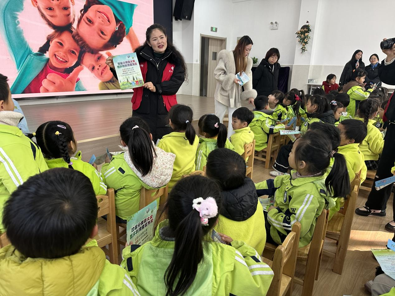 与此同时,排队等候的另一侧热闹非凡。社区工作人员与志愿者们准备了印有各类垃圾图案的卡片和趣味问答题库,用孩子们喜闻乐见的方式普及环保知识。“纸巾擦完鼻涕后是什么垃圾?”“喝完的牛奶瓶要放进哪个颜色的桶里?”志愿者们抛出一个个接地气的问题,孩子们争先恐后地举手抢答,现场气氛热烈而欢快。