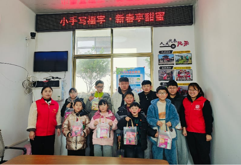 书写环节中,孩子们认真投入、凝心聚力,一笔一画地书写着福字。志愿者分组全程陪伴指导,耐心解答书写疑问,同时鼓励有基础的孩子发挥创意,书写不同字体的福字。虽然笔法略显稚嫩,但每一个福字都饱含童真与美好期盼,墨香萦绕间,孩子们的欢声笑语不断,现场氛围温馨喜庆。活动最后,孩子们纷纷展示自己的作品、交流书写心得。村“两委”为孩子们发放装有亲手写的福字和甜蜜糖果的新春礼盒,传递新春的温暖与祝福。