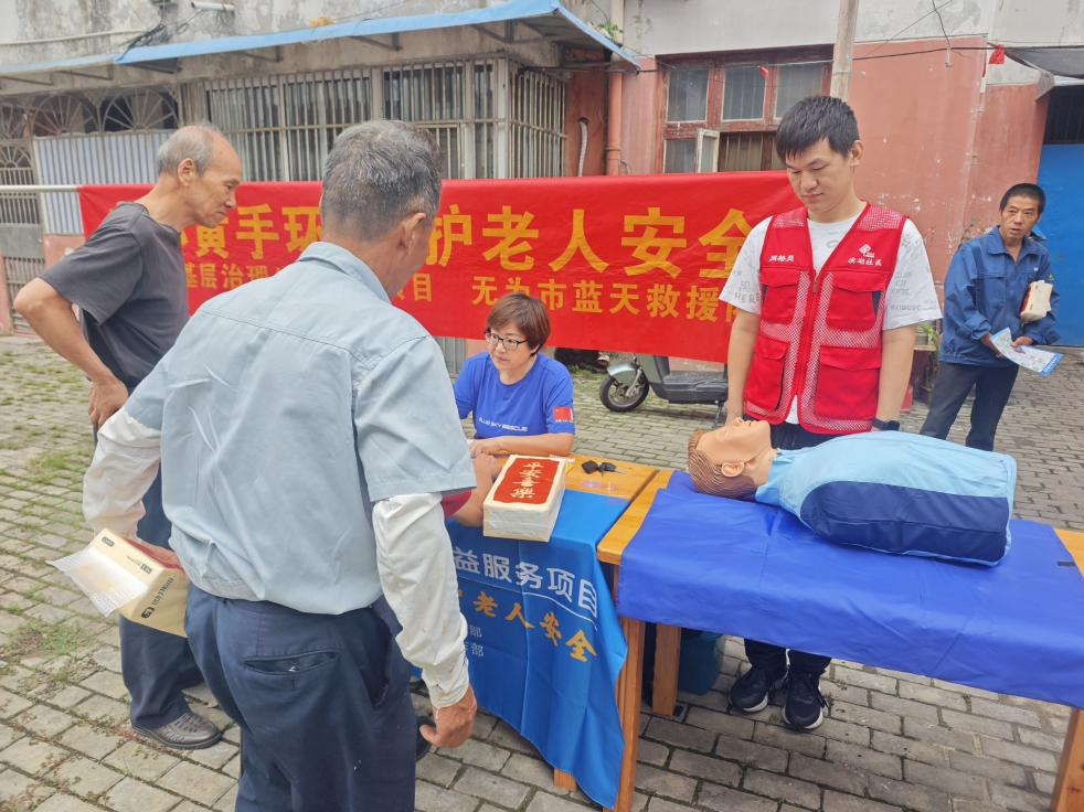 随后,蓝天救援队的杜玉芳老师为有需要的老年居民免费办理并佩戴黄手环。她一边耐心地为老人调整手环的松紧度,确保佩戴舒适,一边细致地讲解使用方法,还通过现场模拟演示,让老人们能更直观地掌握操作要点。
