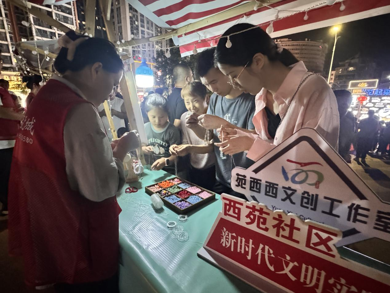 活动现场,桌上五彩斑斓的珠子琳琅满目。社区志愿者为大家介绍了串珠的基本技巧,居民们聚精会神地学习着,纷纷拿起彩珠,他们一手操控珠子,一手操控线绳,精心地串联、调整,编织出精美的作品。更有一些居民大胆创新,探索不同的组合方式,发挥自己的创意,将独特的设计元素融入串珠过程中。看着自己亲手将一颗颗小珠子变成精美的工艺品,大家的脸上都洋溢着满足与喜悦的笑容,成就感满满,遇到穿线不顺、珠子搭配纠结时,邻里间互相搭把手、出主意,热闹又温馨。