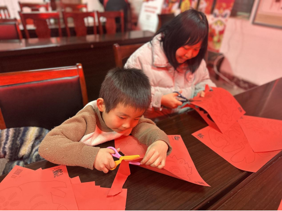 活动现场暖意融融,社区工作人员提前备好大红宣纸、剪刀、刻刀、胶水等工具。活动中,志愿者为大家讲解剪纸的历史渊源与文化寓意,居民们热情高涨,纷纷拿起剪刀尝试创作,孩子们眼神专注,在家长的帮助下剪出稚嫩却充满童趣的图案。
