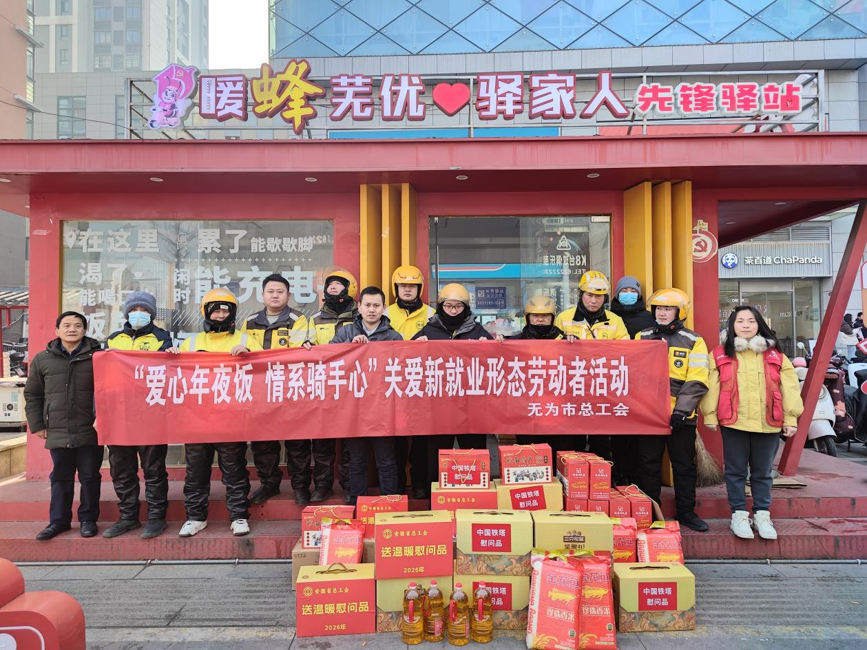 春节将至,年味渐浓。为传递城市温度,致敬奋斗在基层一线的劳动者,2月11日,无城镇太平社区联合无为市总工会、中国铁塔公司、老乡鸡餐饮连锁店共同开展慰问活动,为快递骑手、外卖配送员等新业态群体送上新春礼包,用实际行动诠释对劳动者关怀与致敬。